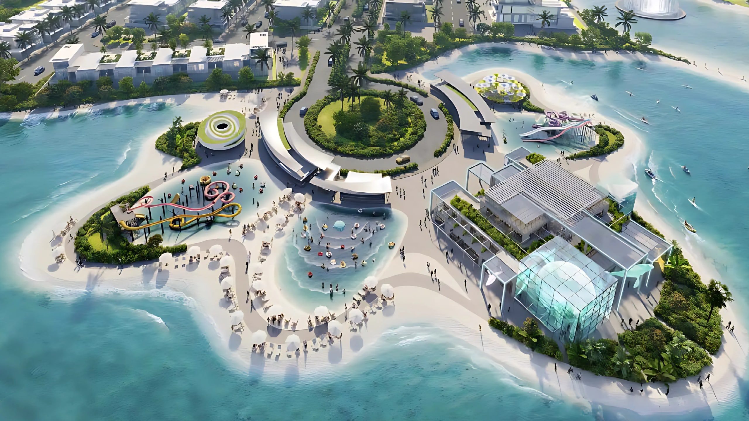 The design philosophy integrates tropical themes with modern innovation, bringing nature and architecture into perfect alignment. The Central Hub Fountain, with its combination of water, fire, and laser effects, serves as a striking landmark. Structures like the Aqua Dome and Aqua Park incorporate immersive projections, entertainment areas, and wellness zones, blending technology with natural inspiration. Floating yoga decks, LED-lit water platforms, and infinity-edge waterfalls create a visually captivating atmosphere throughout the lagoon. Each cluster is carefully designed to reflect its island inspiration, ensuring variety while maintaining a cohesive resort identity. The result is a paradise reimagined for modern living.
