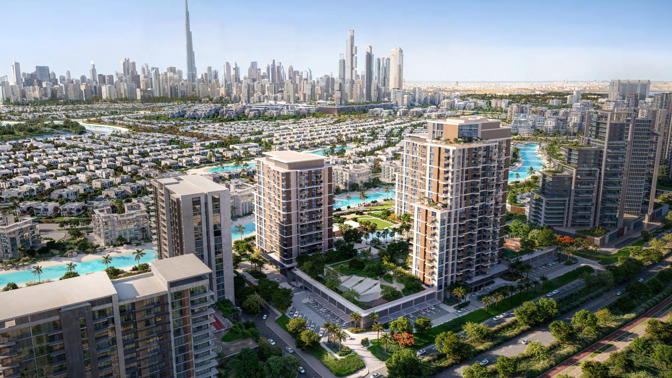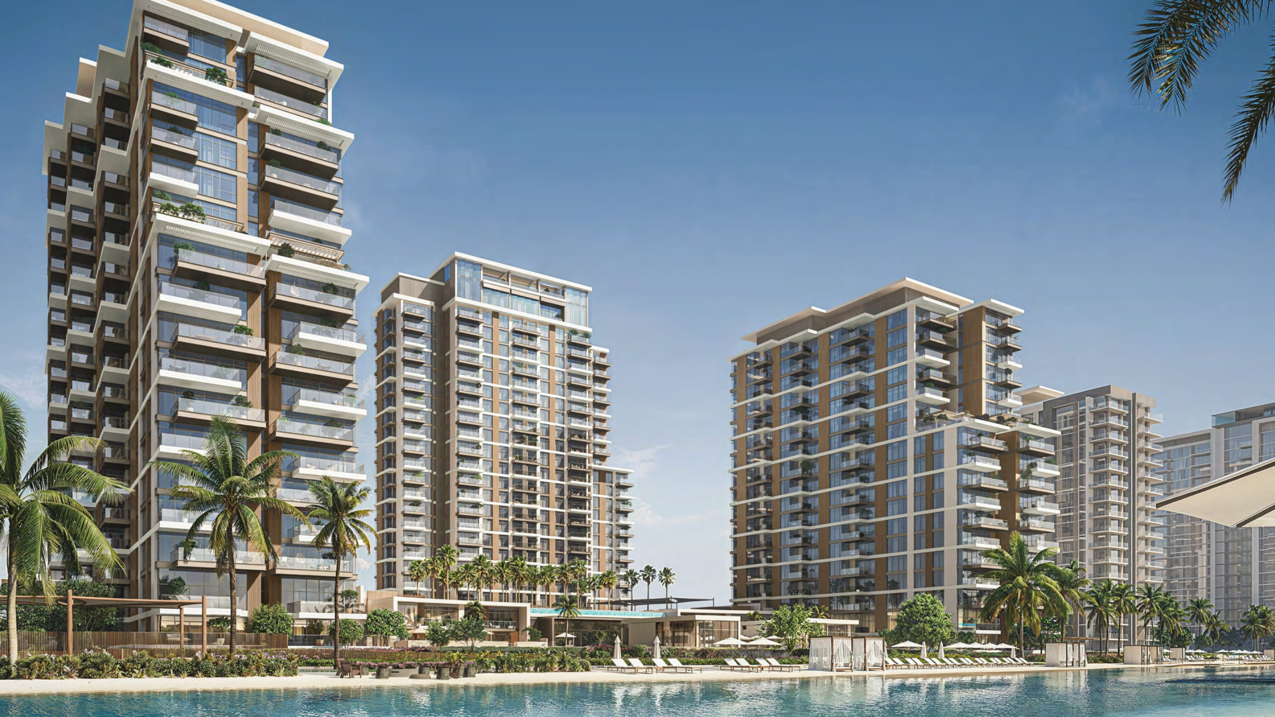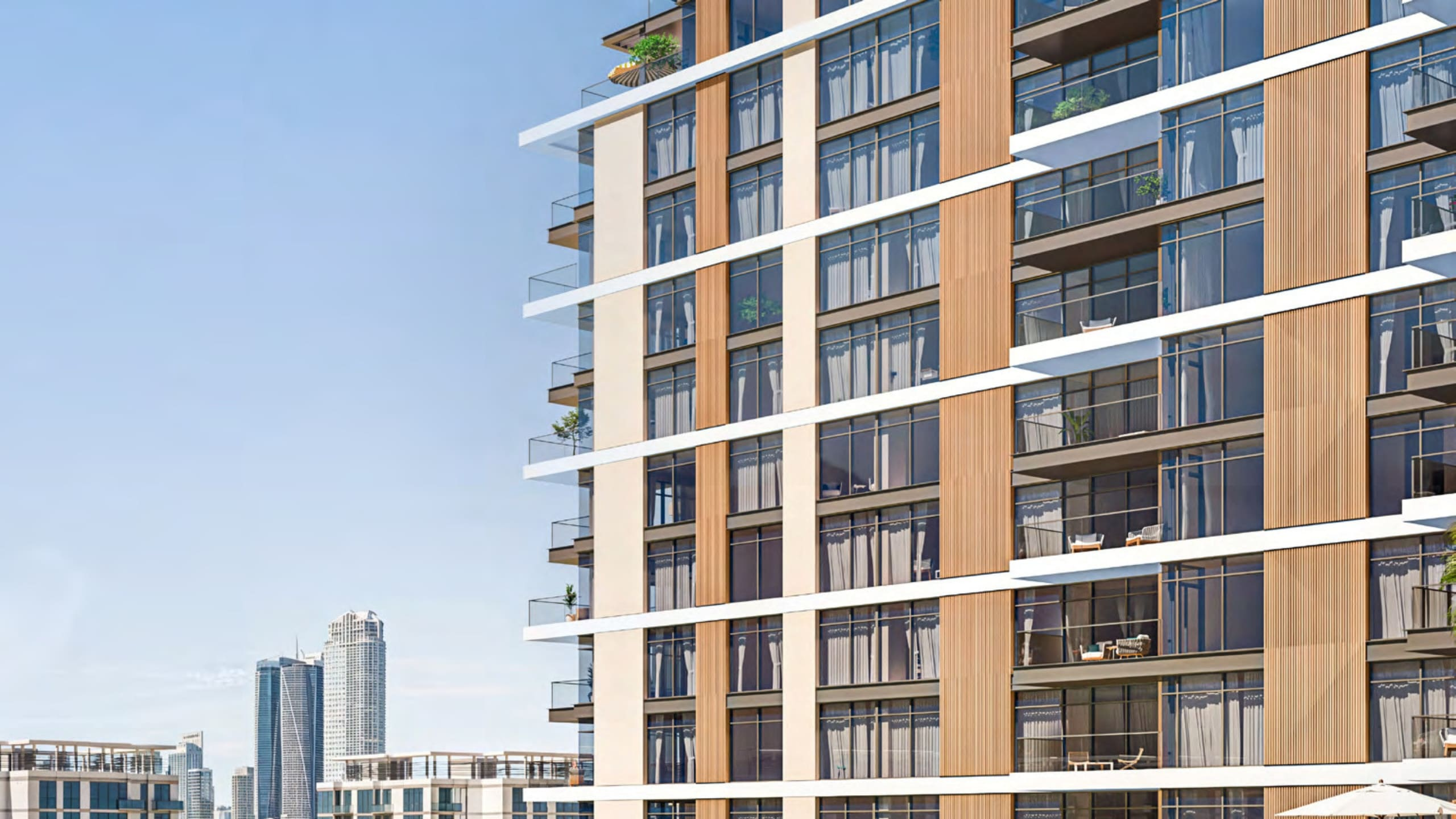 The architectural design of Naya Residences is a striking expression of modern elegance blended with natural harmony. The development features tiered, green-roofed towers that seamlessly integrate with the surrounding landscape while maximising panoramic views of the crystal lagoon and Dubai skyline. Expansive floor-to-ceiling windows flood interiors with natural light, creating open and airy living spaces. Staggered balconies enhance visual flow and strengthen the indoor-outdoor connection. Every architectural element is carefully crafted to combine aesthetic beauty with functional excellence, delivering a refined living environment that embodies sophistication, sustainability, and contemporary luxury.